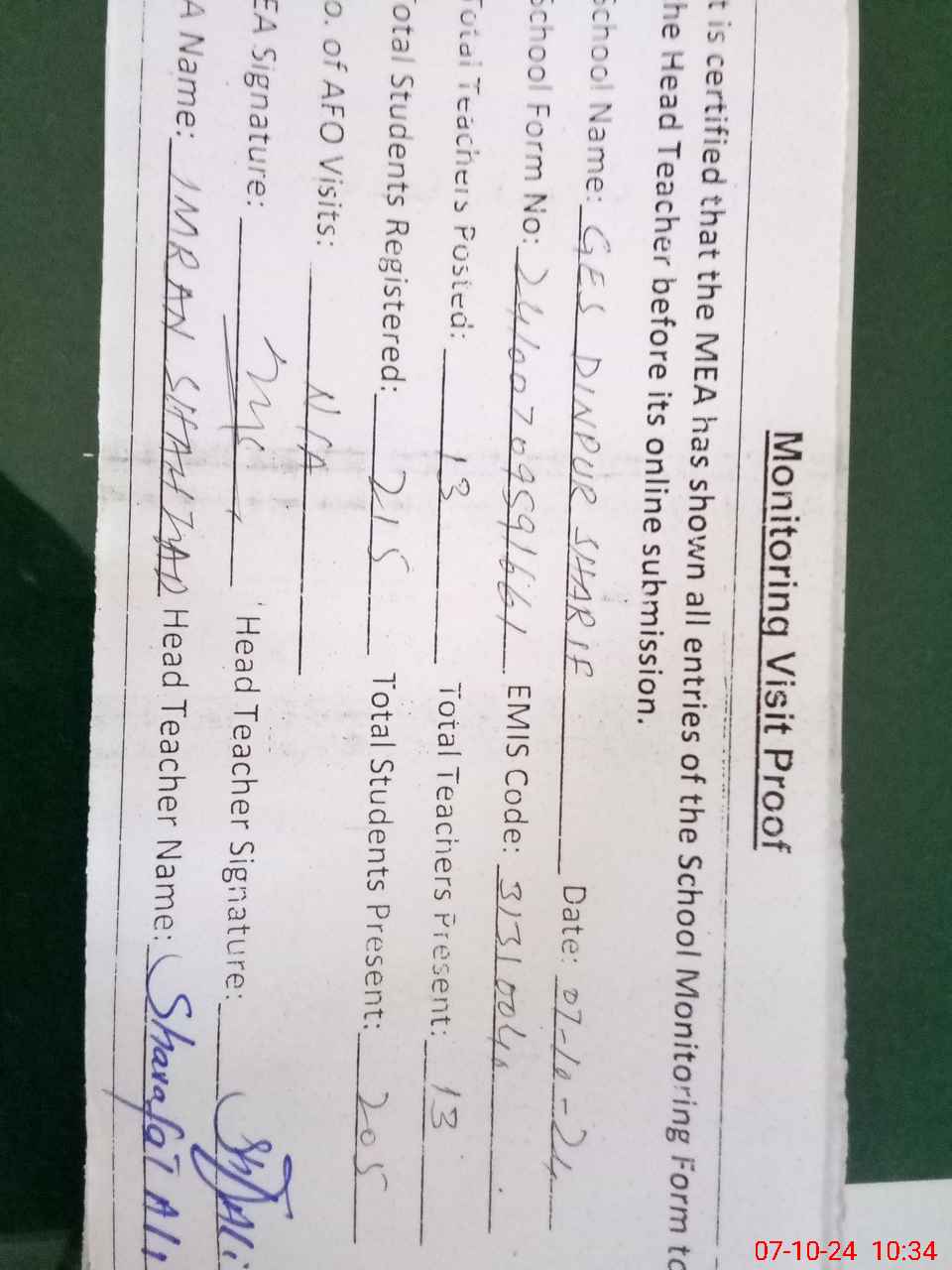| Monitoring Date: 07-10-2024 | Start Time: 07-10-2024 09:59 AM | End Time: 07-10-2024 10:34 AM | Name of MEA: Im**** Sh**** | |