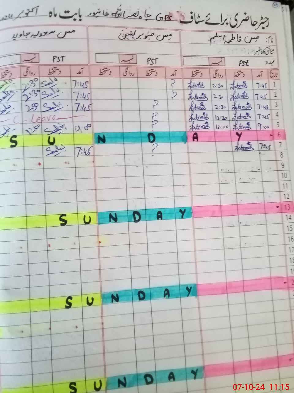 | CNIC | Full Name | Designation | R/C | Absence During Last Calender Month |