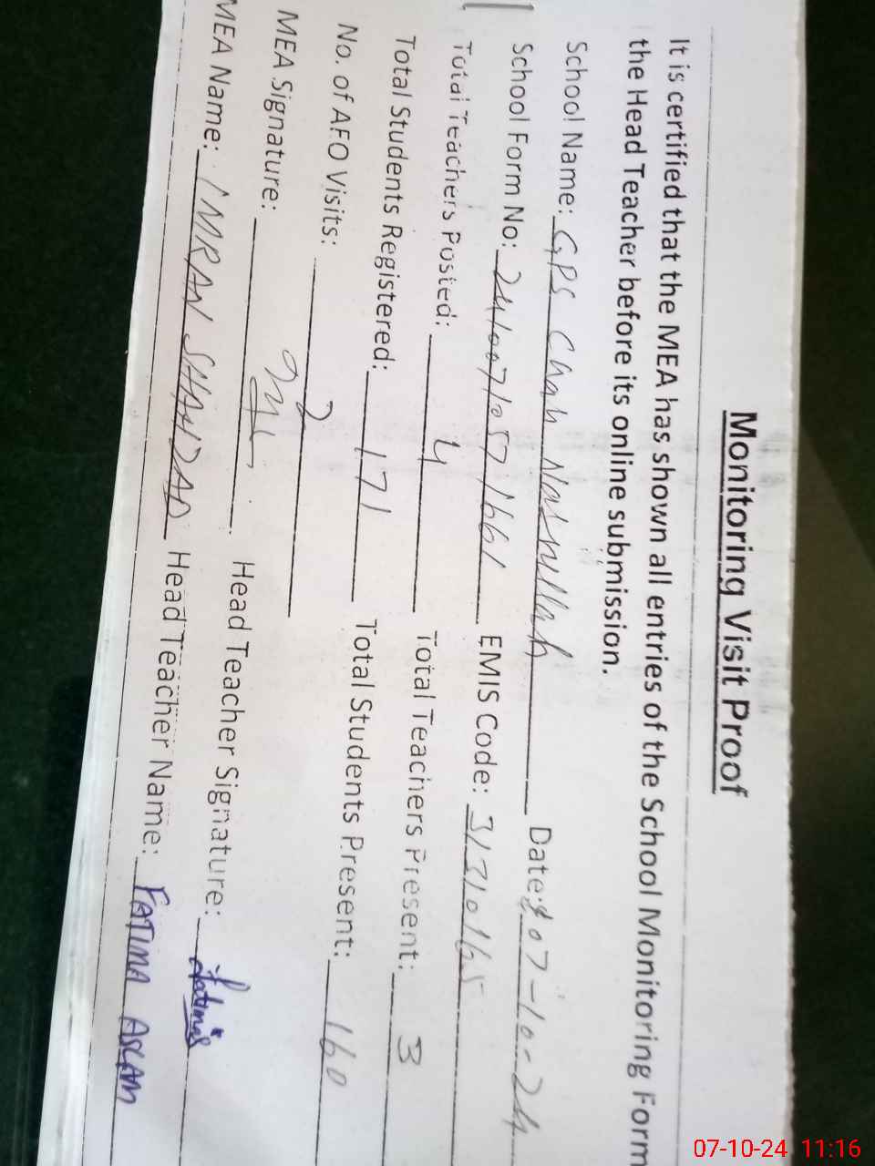 | Attendance Register | Head Teacher | MEA with School | Visit Proof |