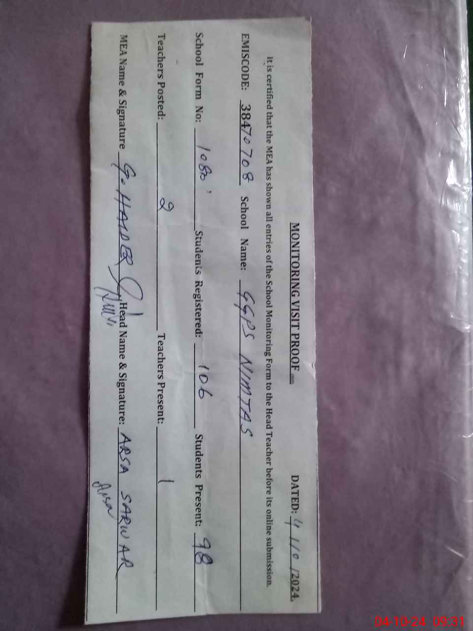 | Certified that this School was Inspected by the Undersigned MEA/DMO Today and the Information Stated Above is as Per Record. | |||||