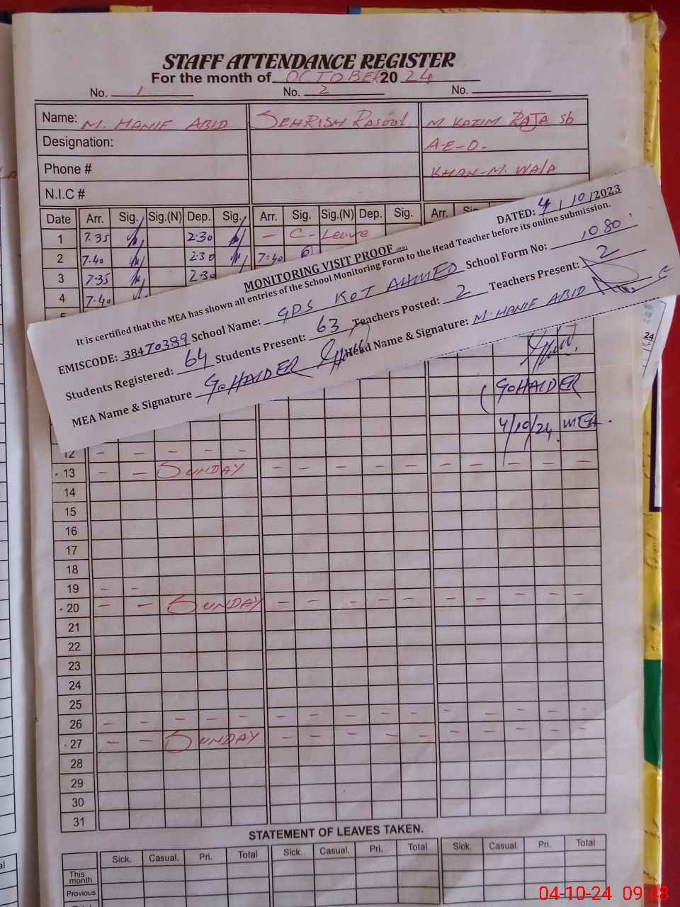 | Attendance Register | Head Teacher | MEA with School | Visit Proof |