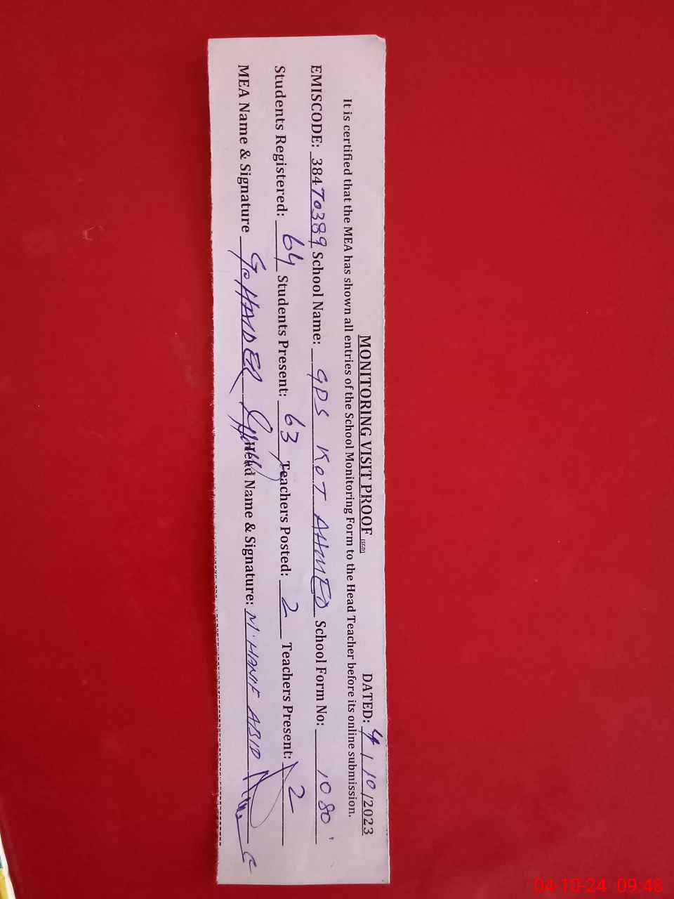 | Certified that this School was Inspected by the Undersigned MEA/DMO Today and the Information Stated Above is as Per Record. | |||||