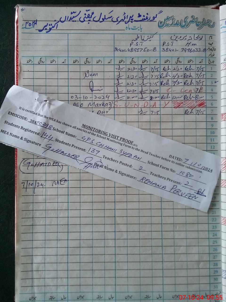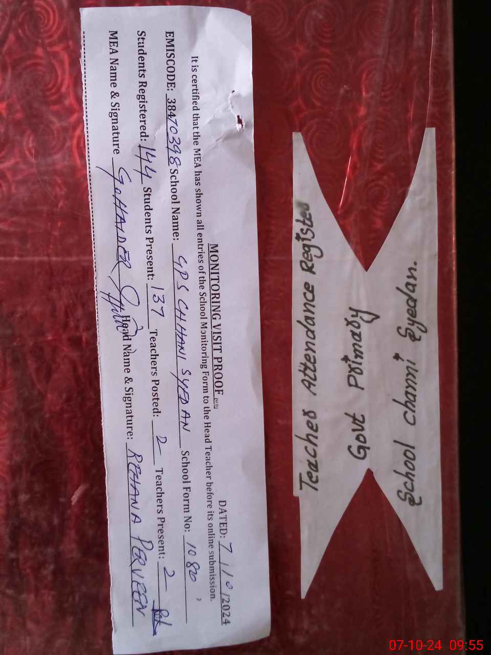 | Attendance Register | Head Teacher | MEA with School | Visit Proof |