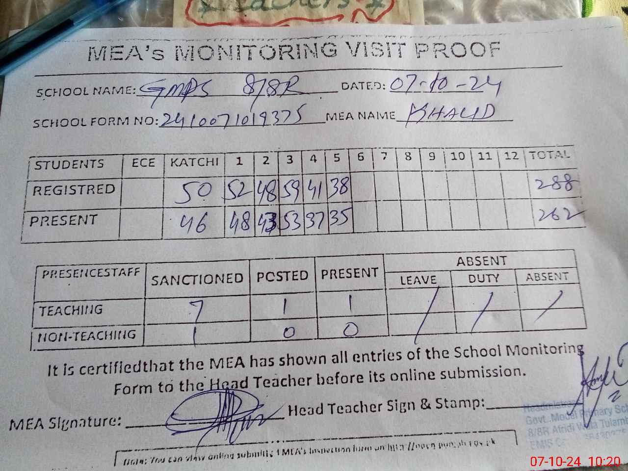 | Attendance Register | Head Teacher | MEA with School | Visit Proof |