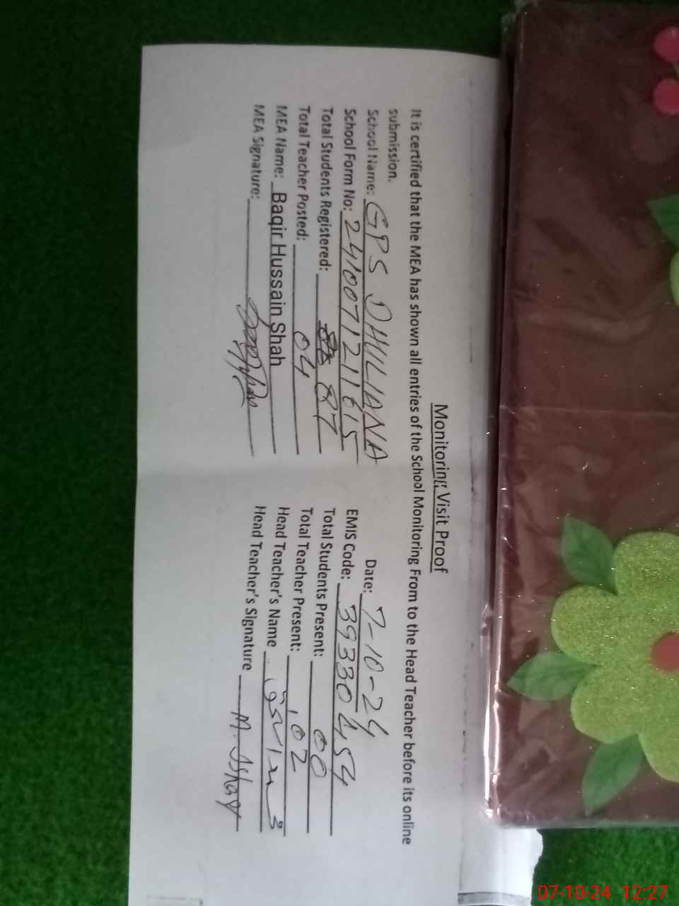 | Attendance Register | Head Teacher | MEA with School | Visit Proof |