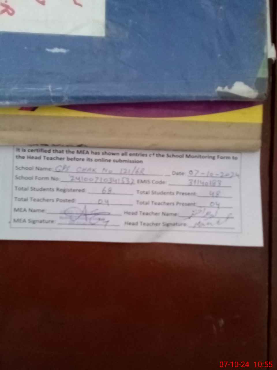 | Certified that this School was Inspected by the Undersigned MEA/DMO Today and the Information Stated Above is as Per Record. | |||||