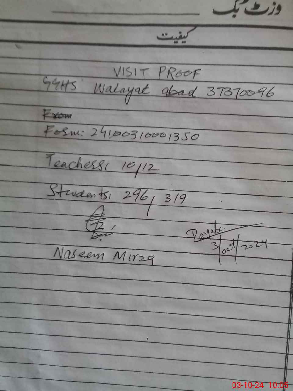 | EMIS Code: 37370096 | Name of School: GGHS WALAYAT ABAD | |||