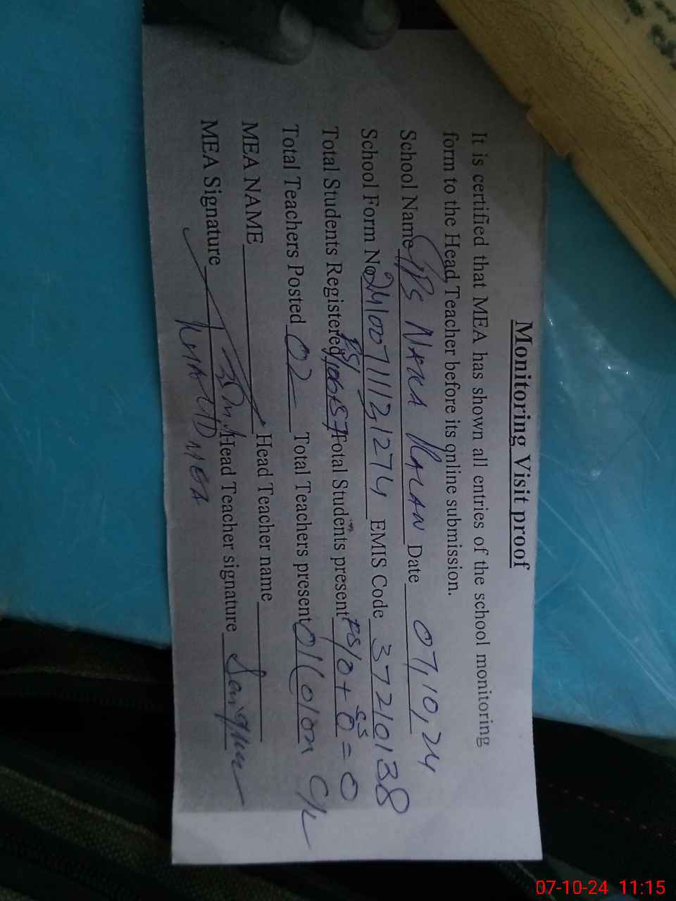 | Attendance Register | Head Teacher | MEA with School | Visit Proof |