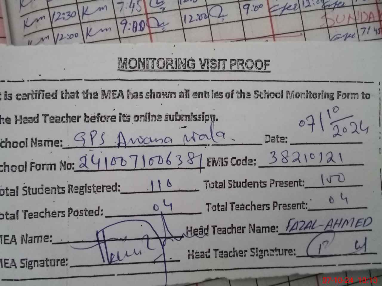 | Attendance Register | Head Teacher | MEA with School | Visit Proof |
