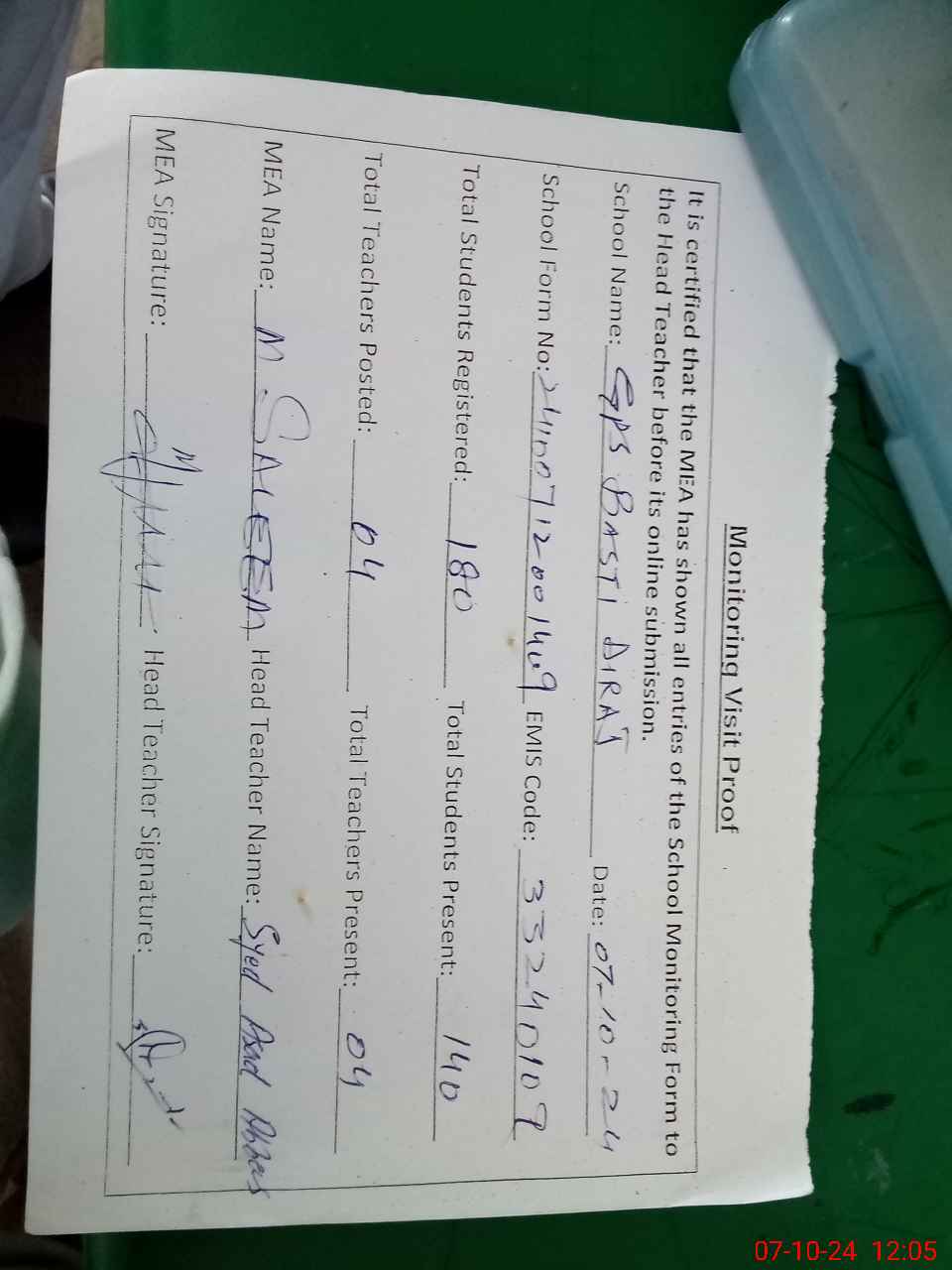 | Attendance Register | Head Teacher | MEA with School | Visit Proof |