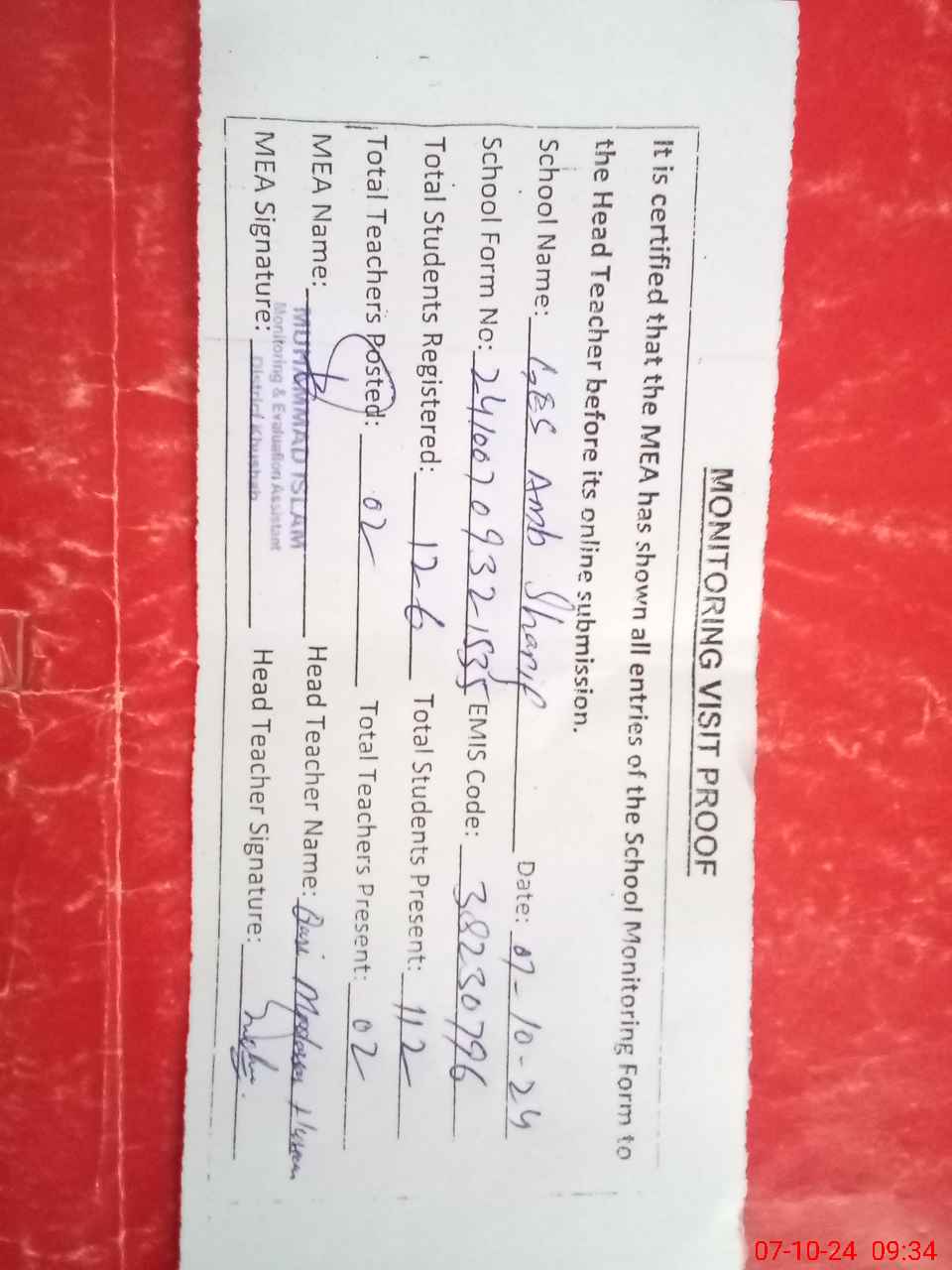 | Certified that this School was Inspected by the Undersigned MEA/DMO Today and the Information Stated Above is as Per Record. | |||||