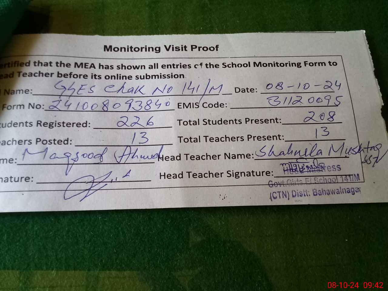 | Monitoring Date: 08-10-2024 | Start Time: 08-10-2024 09:12 AM | End Time: 08-10-2024 09:46 AM | Name of MEA: Ma**** Ah**** BN**** 20 | |