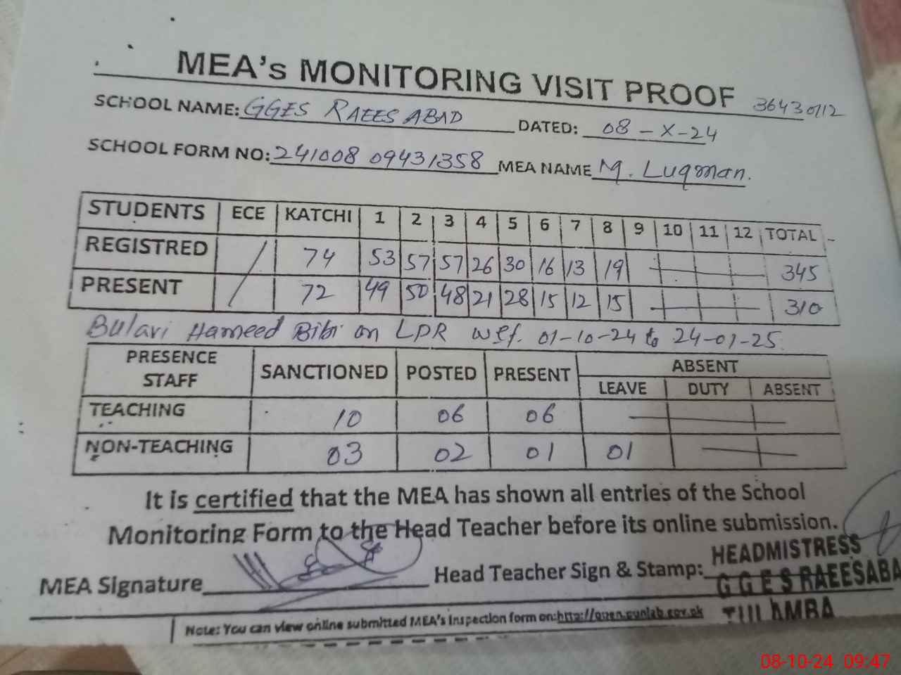 | Monitoring Date: 08-10-2024 | Start Time: 08-10-2024 08:52 AM | End Time: 08-10-2024 09:48 AM | Name of MEA: Mu**** Lu**** | |