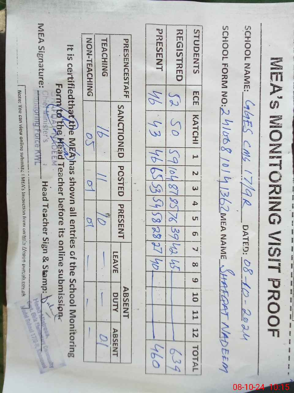 | Attendance Register | Head Teacher | MEA with School | Visit Proof |