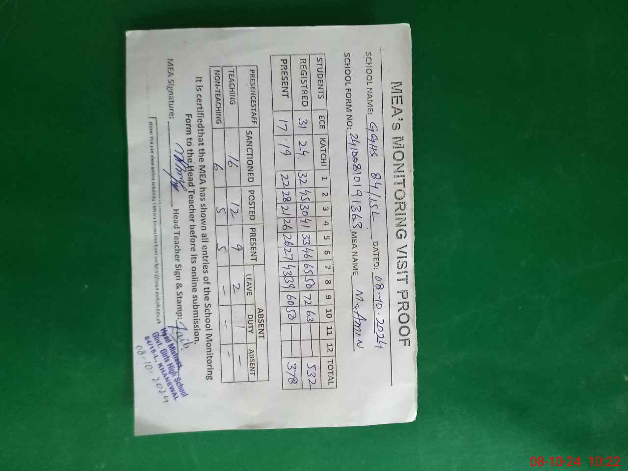 | Certified that this School was Inspected by the Undersigned MEA/DMO Today and the Information Stated Above is as Per Record. | |||||