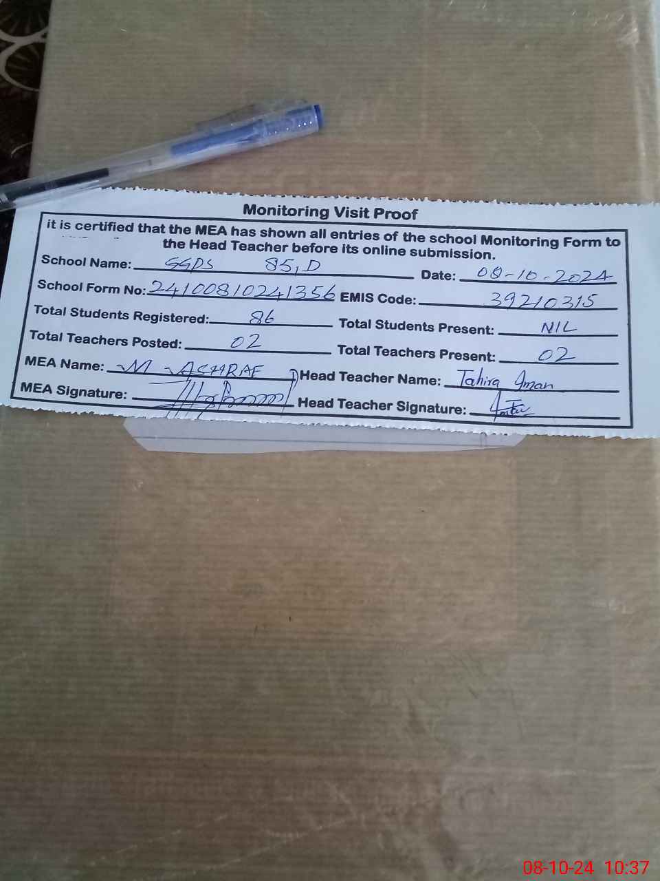 | Certified that this School was Inspected by the Undersigned MEA/DMO Today and the Information Stated Above is as Per Record. | |||||