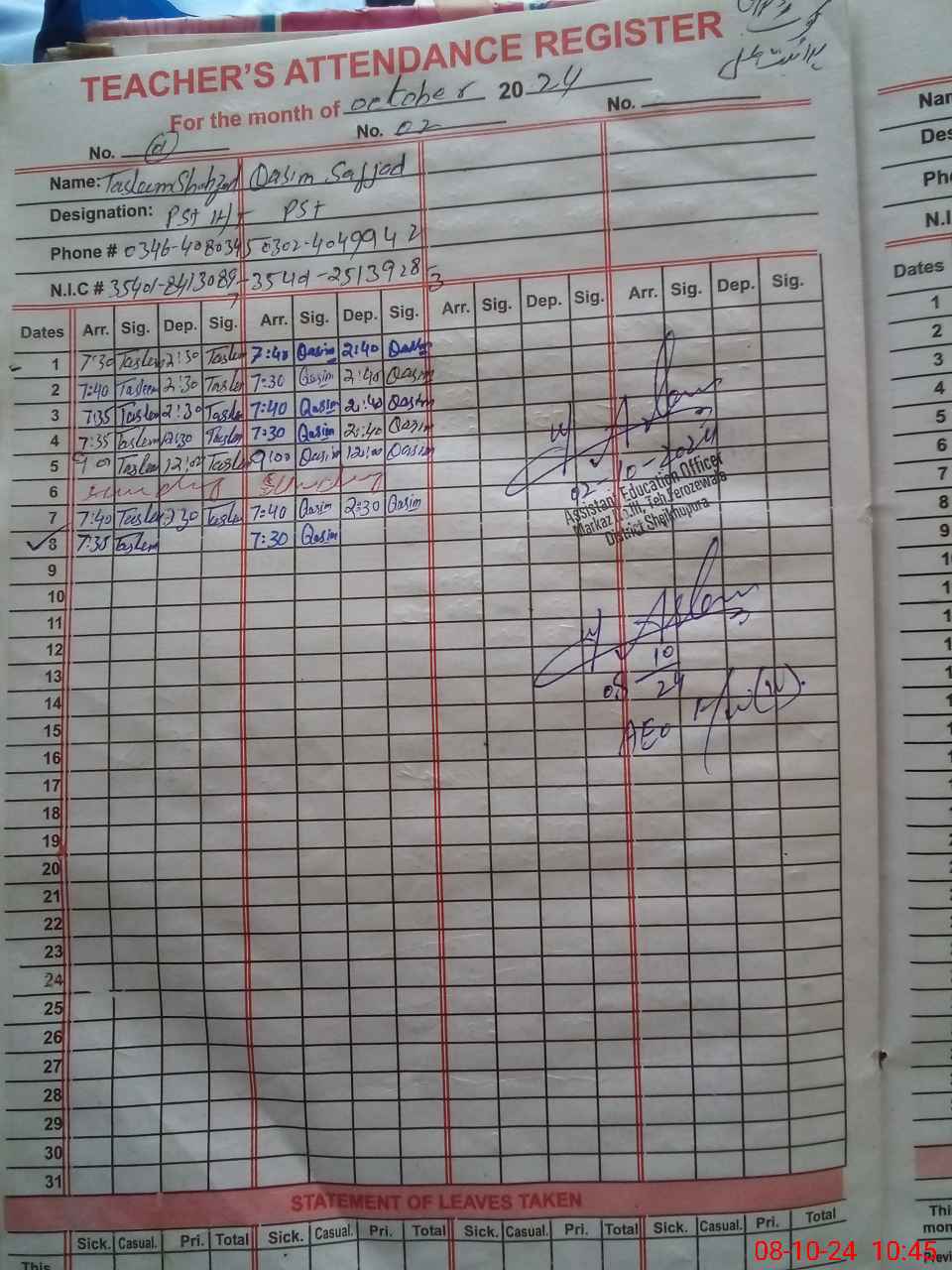 | CNIC | Full Name | Designation | R/C | Absence During Last Calender Month |