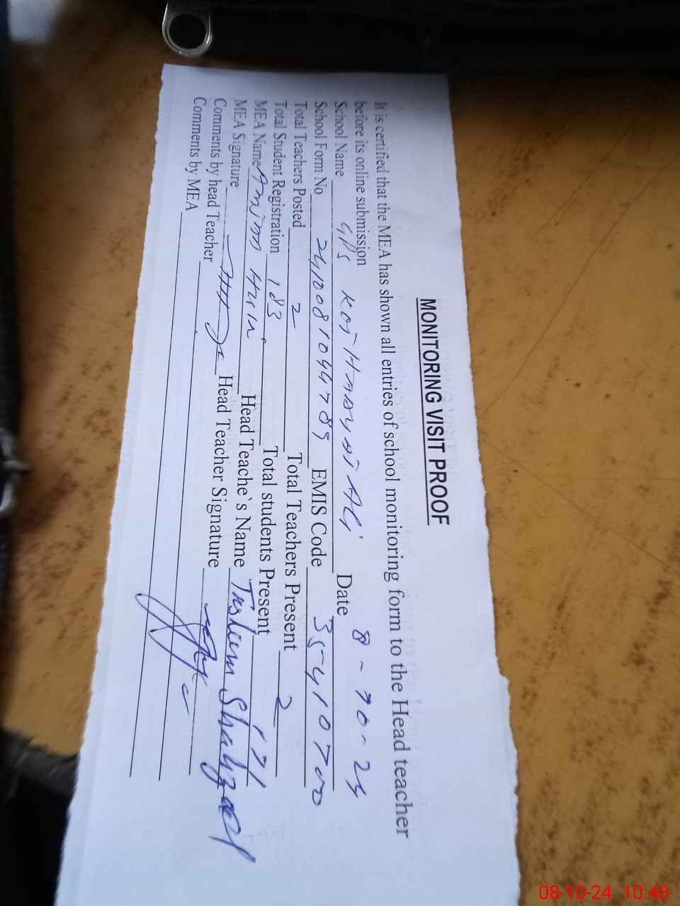 | Attendance Register | Head Teacher | MEA with School | Visit Proof |