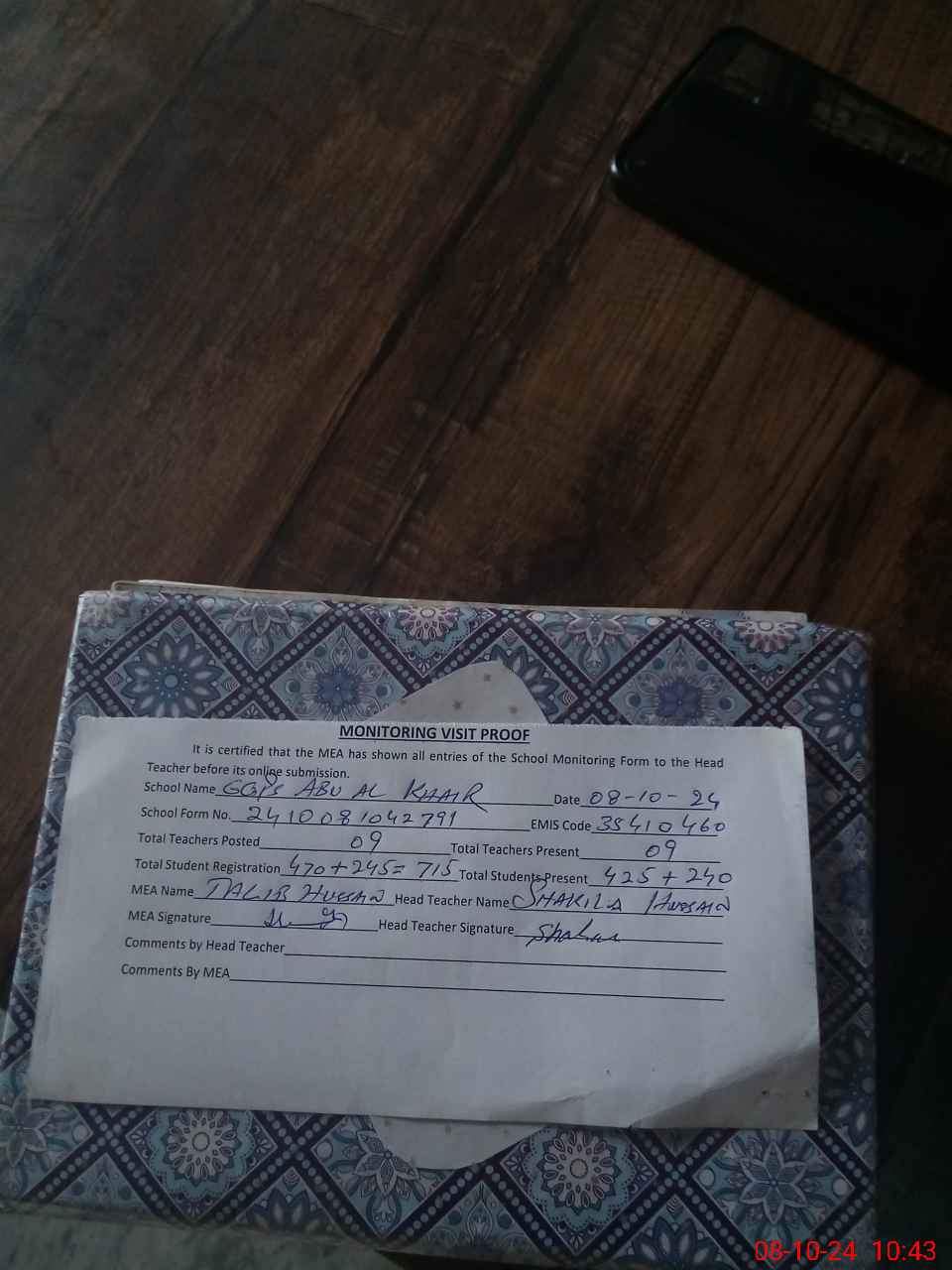 | Certified that this School was Inspected by the Undersigned MEA/DMO Today and the Information Stated Above is as Per Record. | |||||