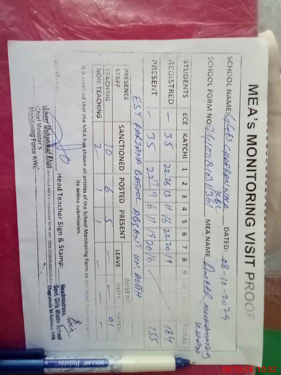 | Certified that this School was Inspected by the Undersigned MEA/DMO Today and the Information Stated Above is as Per Record. | |||||