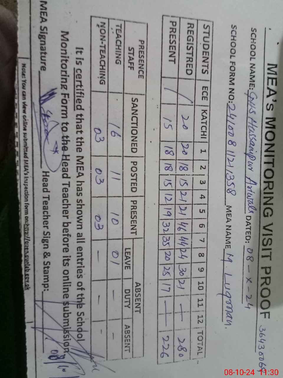 | Attendance Register | Head Teacher | MEA with School | Visit Proof |