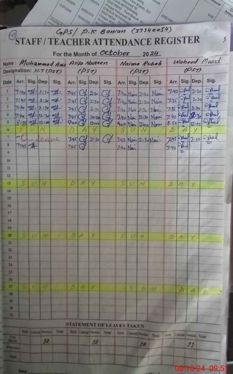 | Remarks (Use Separate Page if Required): Misbah sultana PST Physically present in school name not included in SIS | |||||