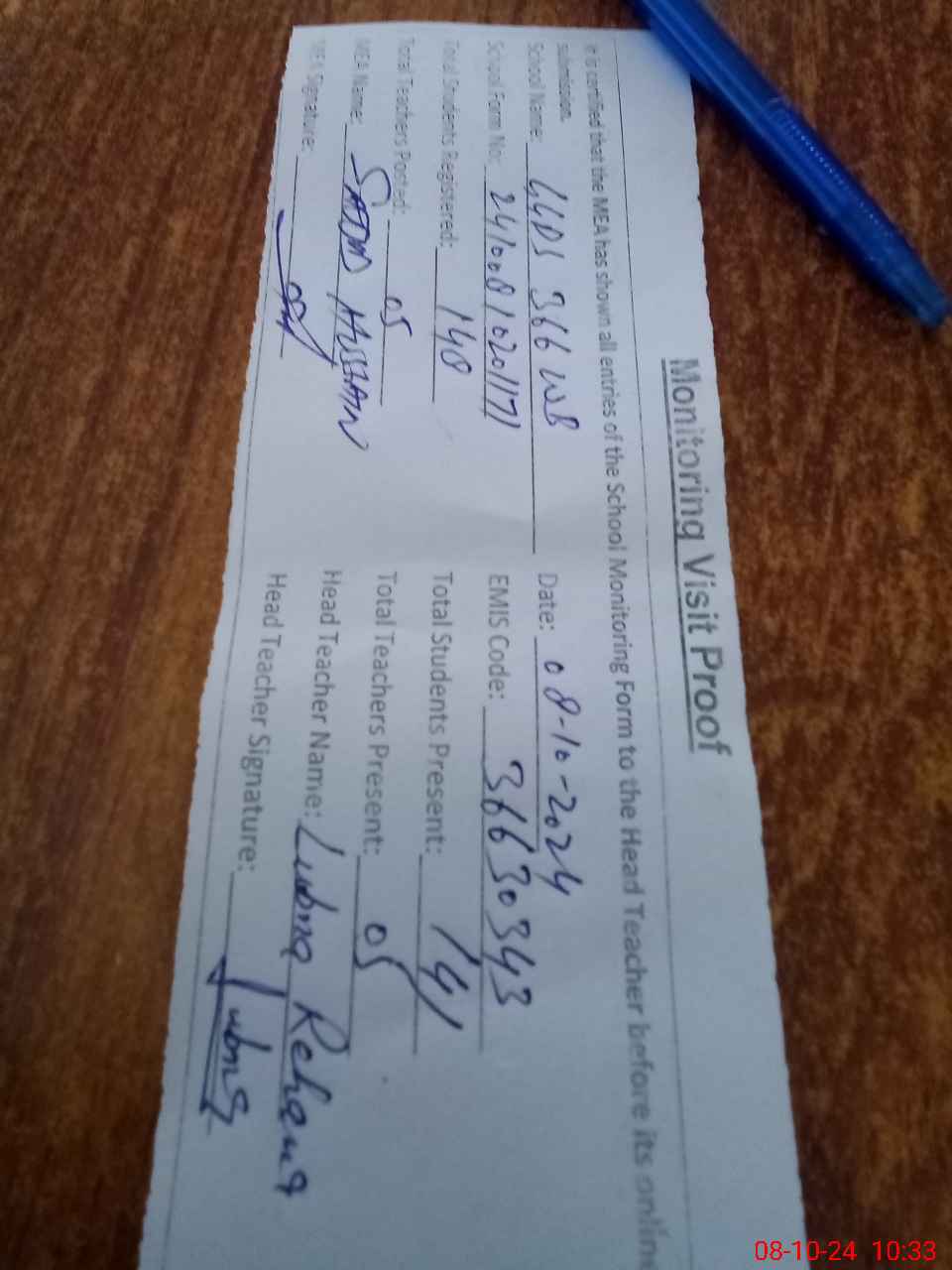 | Name: LU**** RE**** Designation: (School Headmaster's/Headmistress's) PST Phone/Cell Number: 03**** |