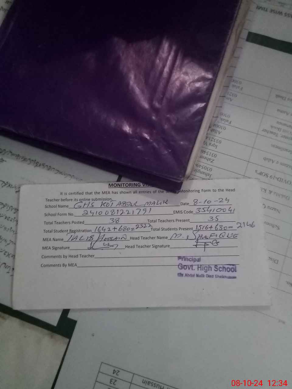 | Attendance Register | Head Teacher | MEA with School | Visit Proof |