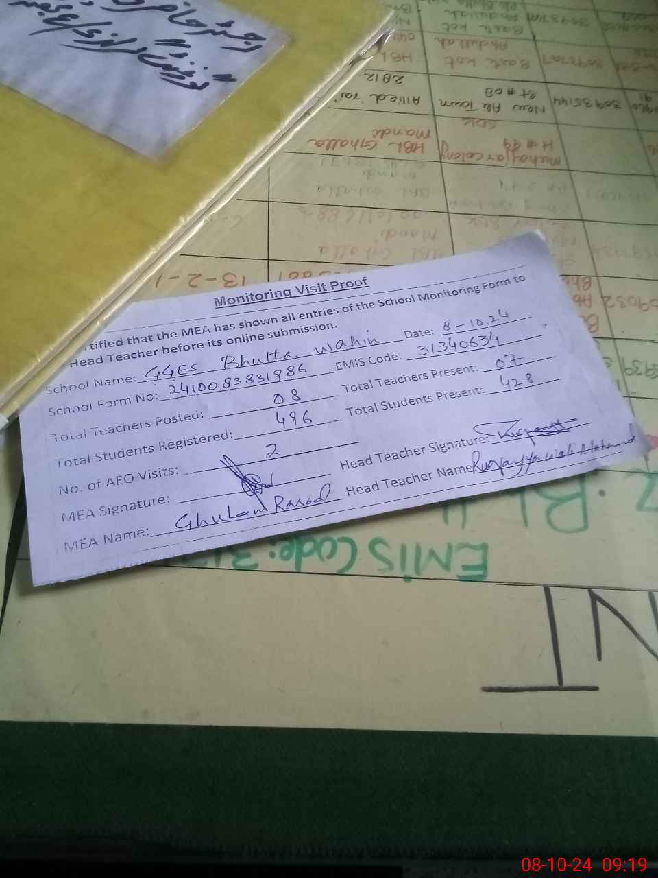 | Attendance Register | Head Teacher | MEA with School | Visit Proof |