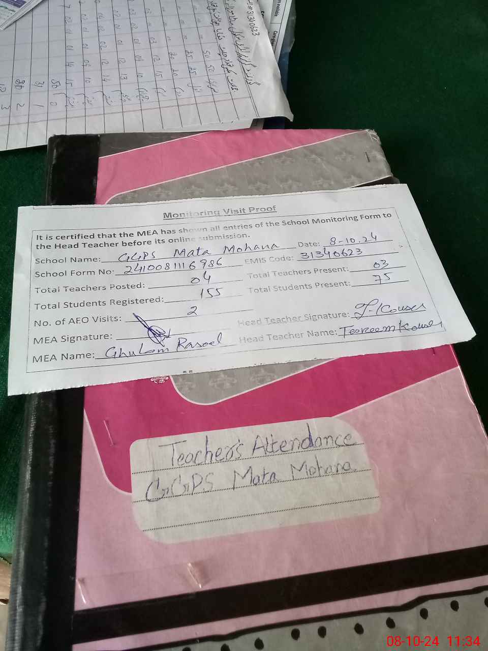 | Attendance Register | Head Teacher | MEA with School | Visit Proof |