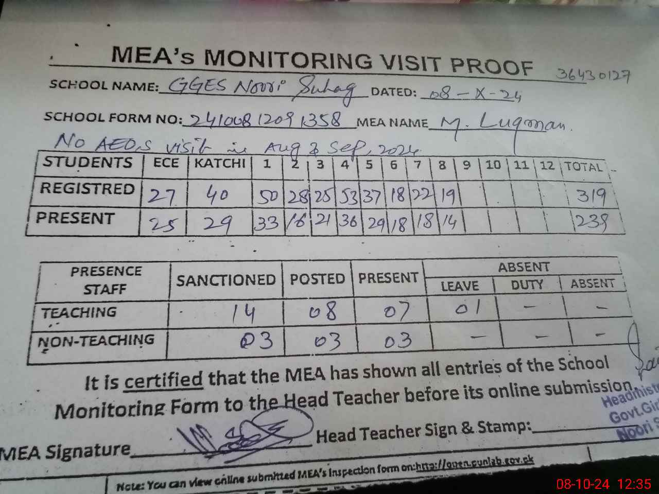 | Certified that this School was Inspected by the Undersigned MEA/DMO Today and the Information Stated Above is as Per Record. | |||||