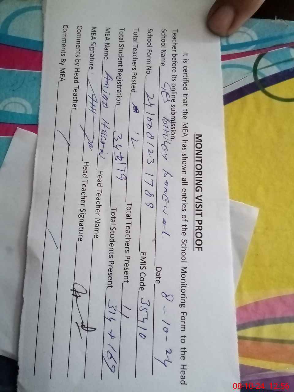 | Attendance Register | Head Teacher | MEA with School | Visit Proof |