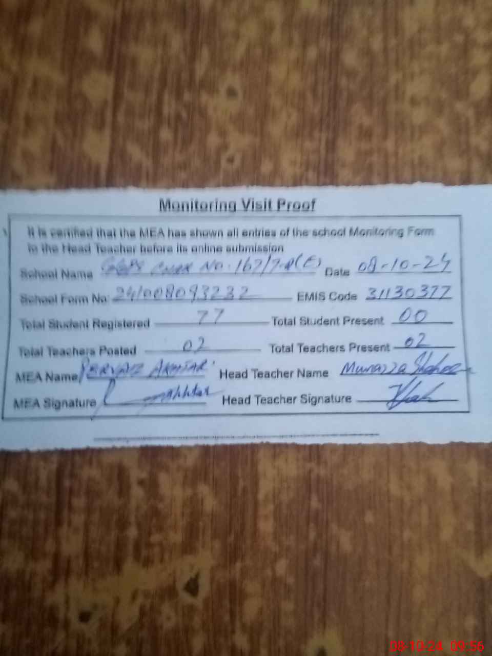| Attendance Register | Head Teacher | MEA with School | Visit Proof |
