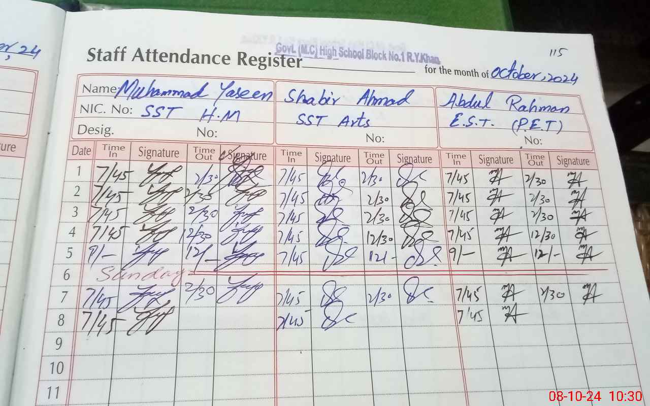 | CNIC | Full Name | Designation | R/C | Absence During Last Calender Month |