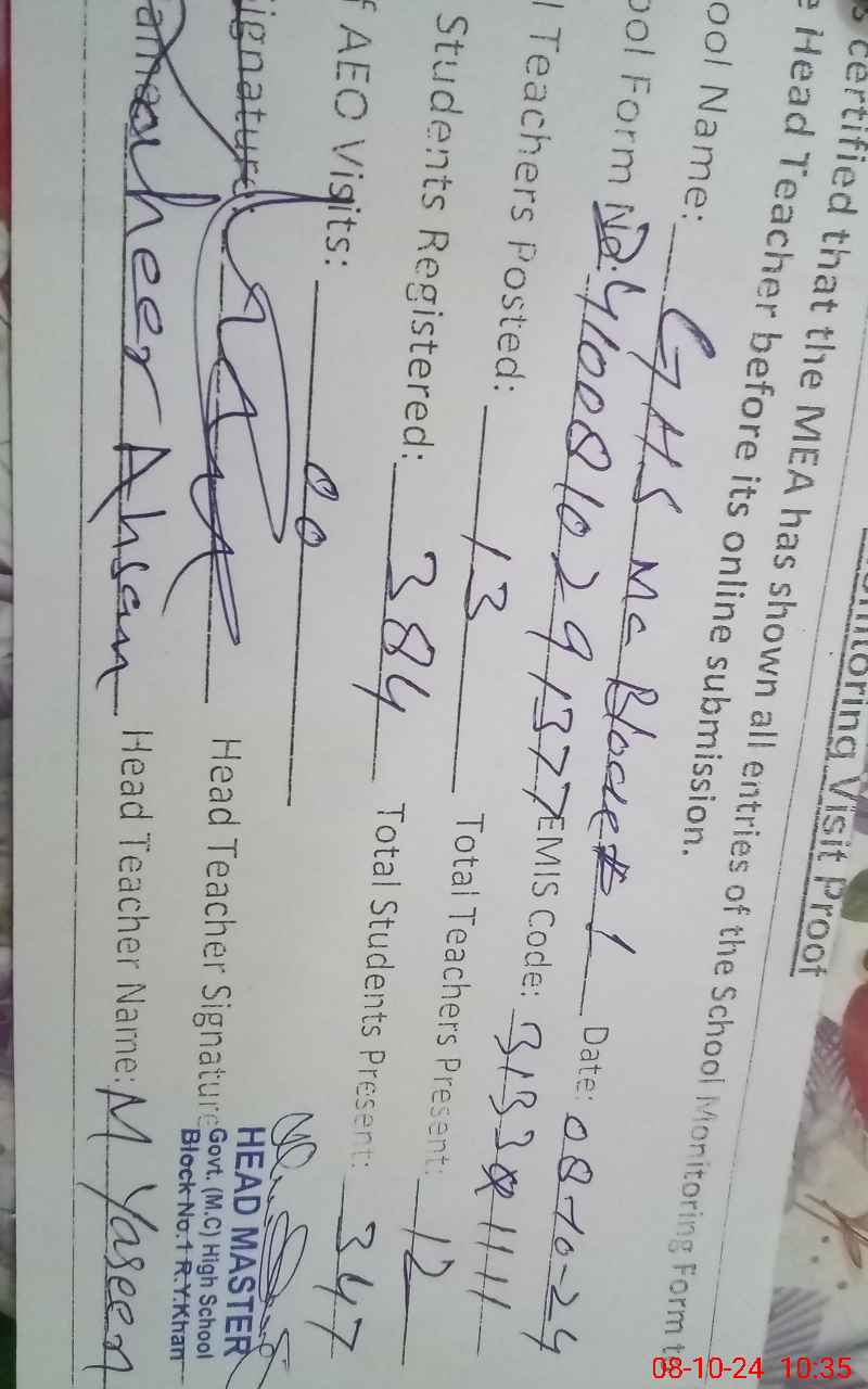 | EMIS Code: 31331111 | Name of School: GHS MC BLOCK NO. 1 | |||