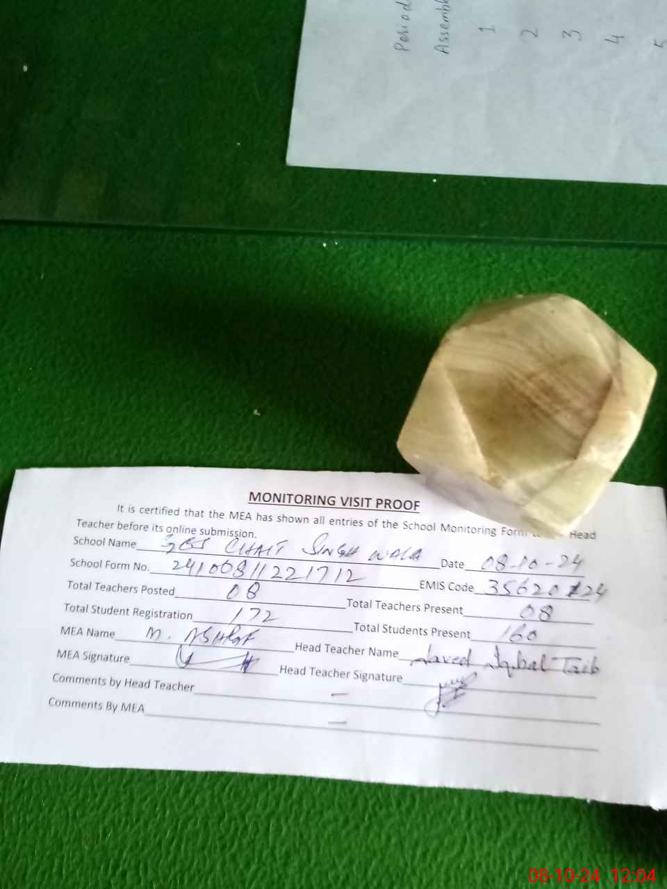 | Attendance Register | Head Teacher | MEA with School | Visit Proof |
