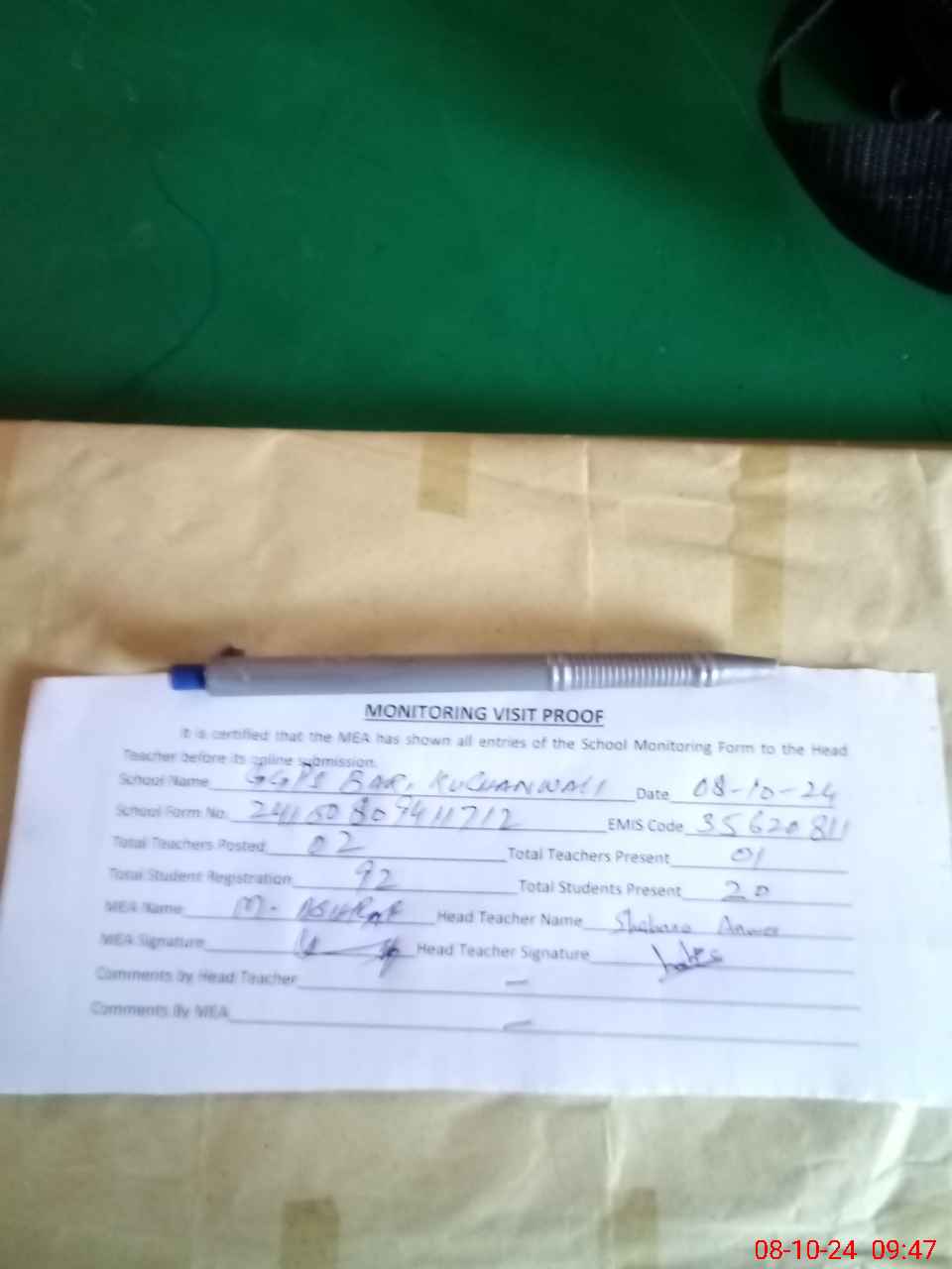 | Attendance Register | Head Teacher | MEA with School | Visit Proof |