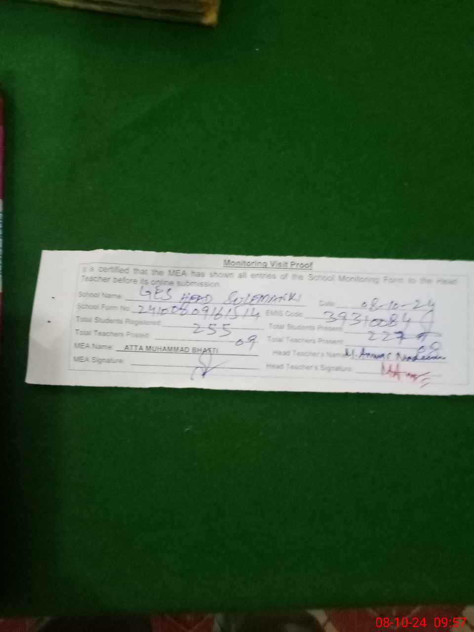 | Monitoring Date: 08-10-2024 | Start Time: 08-10-2024 09:01 AM | End Time: 08-10-2024 09:58 AM | Name of MEA: AT**** MU**** | |