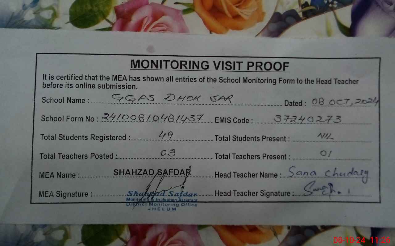 | EMIS Code: 37240273 | Name of School: GGPS DHOK SAR | |||