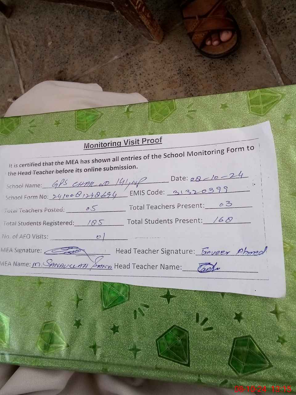 | Monitoring Date: 08-10-2024 | Start Time: 08-10-2024 12:48 PM | End Time: 08-10-2024 01:16 PM | Name of MEA: Mu**** Sa**** Ul**** Sa**** | |