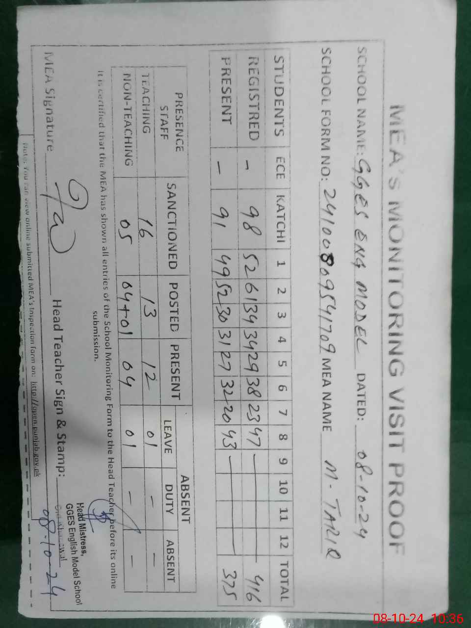 | Monitoring Date: 08-10-2024 | Start Time: 08-10-2024 09:54 AM | End Time: 08-10-2024 10:41 AM | Name of MEA: MU**** TA**** | |