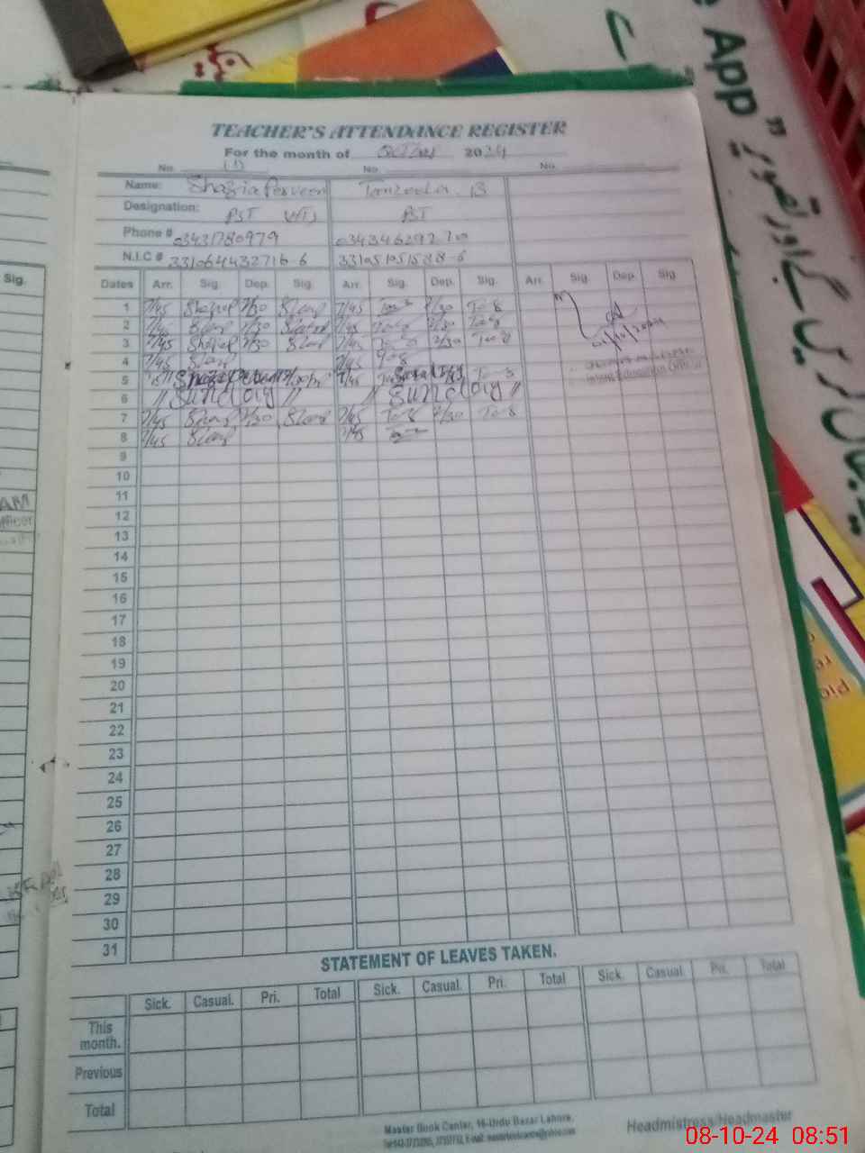 | CNIC | Full Name | Designation | R/C | Absence During Last Calender Month |