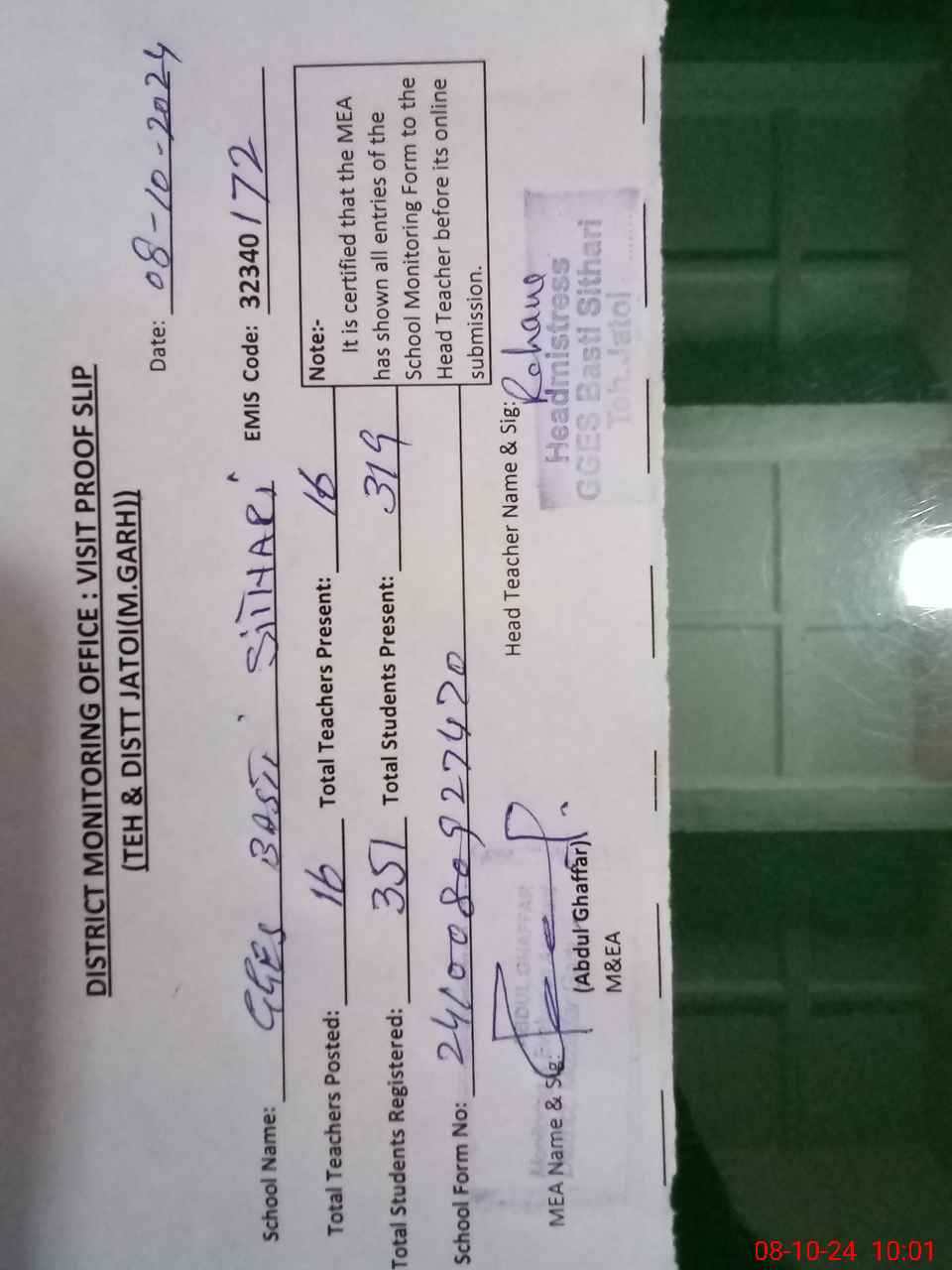 | Certified that this School was Inspected by the Undersigned MEA/DMO Today and the Information Stated Above is as Per Record. | |||||