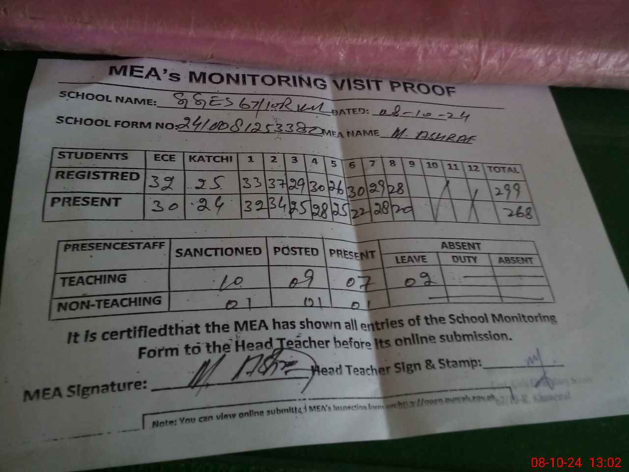 | Certified that this School was Inspected by the Undersigned MEA/DMO Today and the Information Stated Above is as Per Record. | |||||