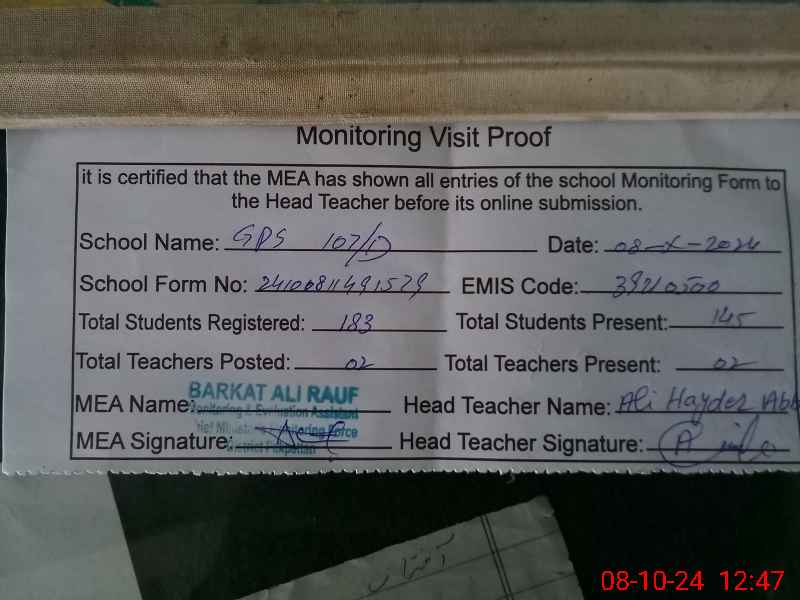 | Certified that this School was Inspected by the Undersigned MEA/DMO Today and the Information Stated Above is as Per Record. | |||||