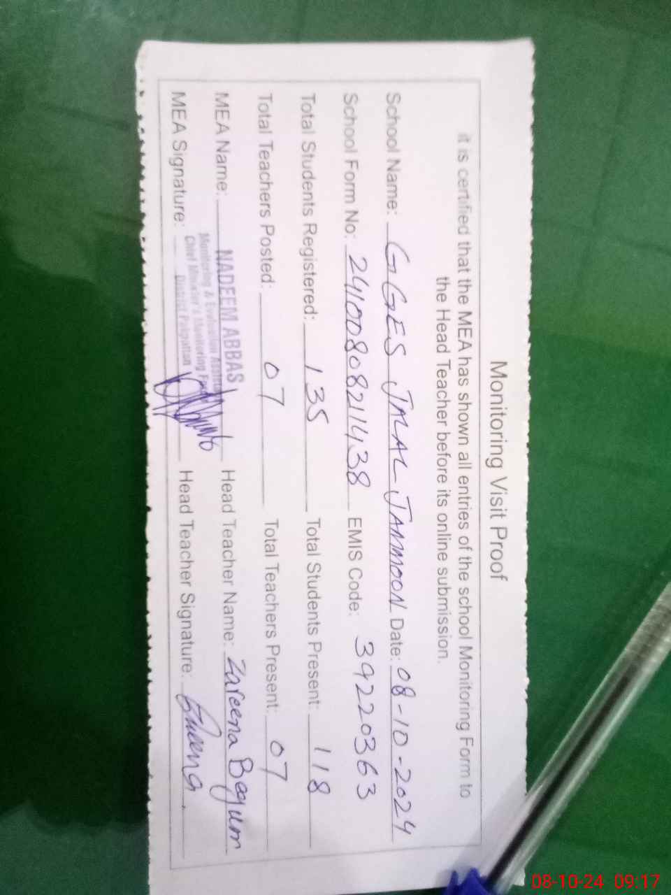 | Attendance Register | Head Teacher | MEA with School | Visit Proof |