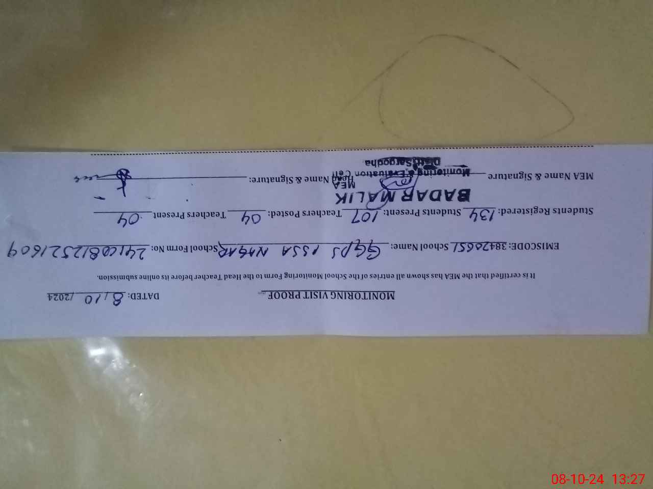 | Attendance Register | Head Teacher | MEA with School | Visit Proof |