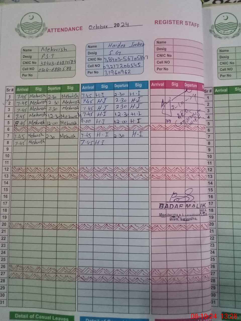 | CNIC | Full Name | Designation | R/C | Absence during last cal. month |