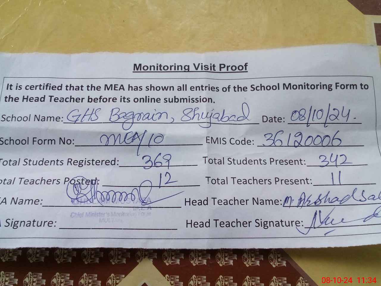 | Attendance Register | Head Teacher | MEA with School | Visit Proof |
