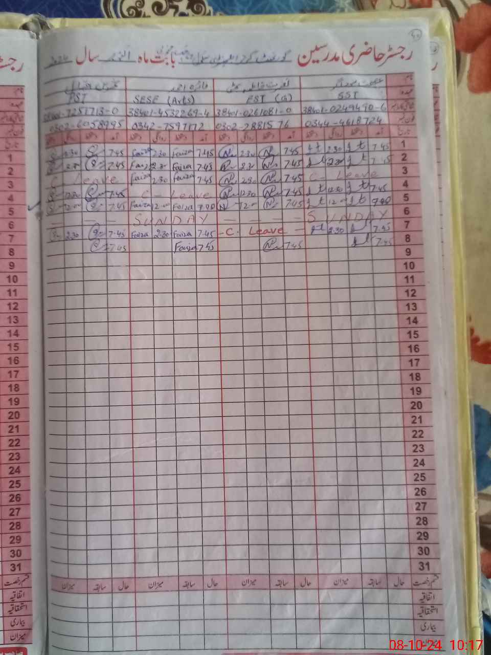 | CNIC | Full Name | Designation | R/C | Absence During Last Calender Month |